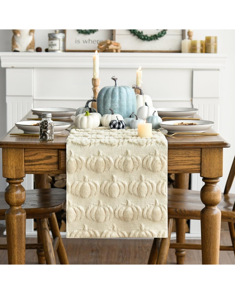 Wrap your table in sweater-like charm. This plush knit table runner features a repeating 3D pumpkin pattern that pops from a warm cream base—soft, tactile, and irresistibly autumnal.
