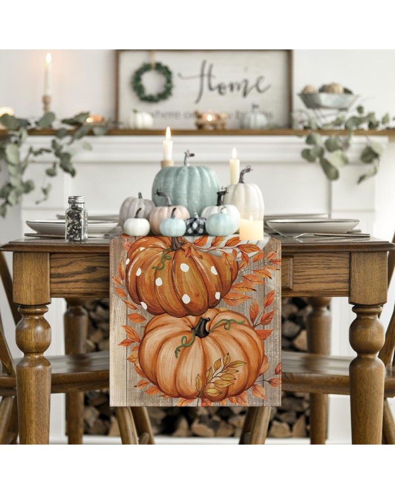 Warm up your table with a stack of hand-painted pumpkins and embrace the warm autumn vibes. Layers of orange gourds are adorned with playful polka dots, while creamy white pumpkins are interspersed among golden leaves against a backdrop of rustic woodgrain, instantly creating a festive farmhouse vibe.